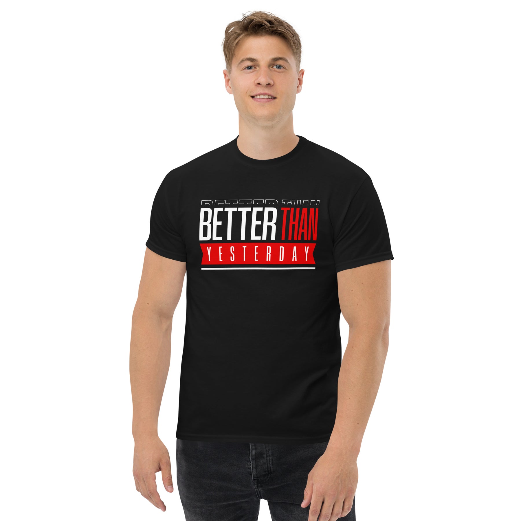 Every day is a new opportunity to be better than the day before. Seize the day with this motivational T-shirt. With a bold and modern design, this T-shirt will help keep you focused on your goals. Made from a comfortable cotton blend, this T-shirt is perfect for working out or running errands. And because it's from hatkofit, you know it's made with quality in mind. Get out there and show the world what you're made of—you're better than yesterday.